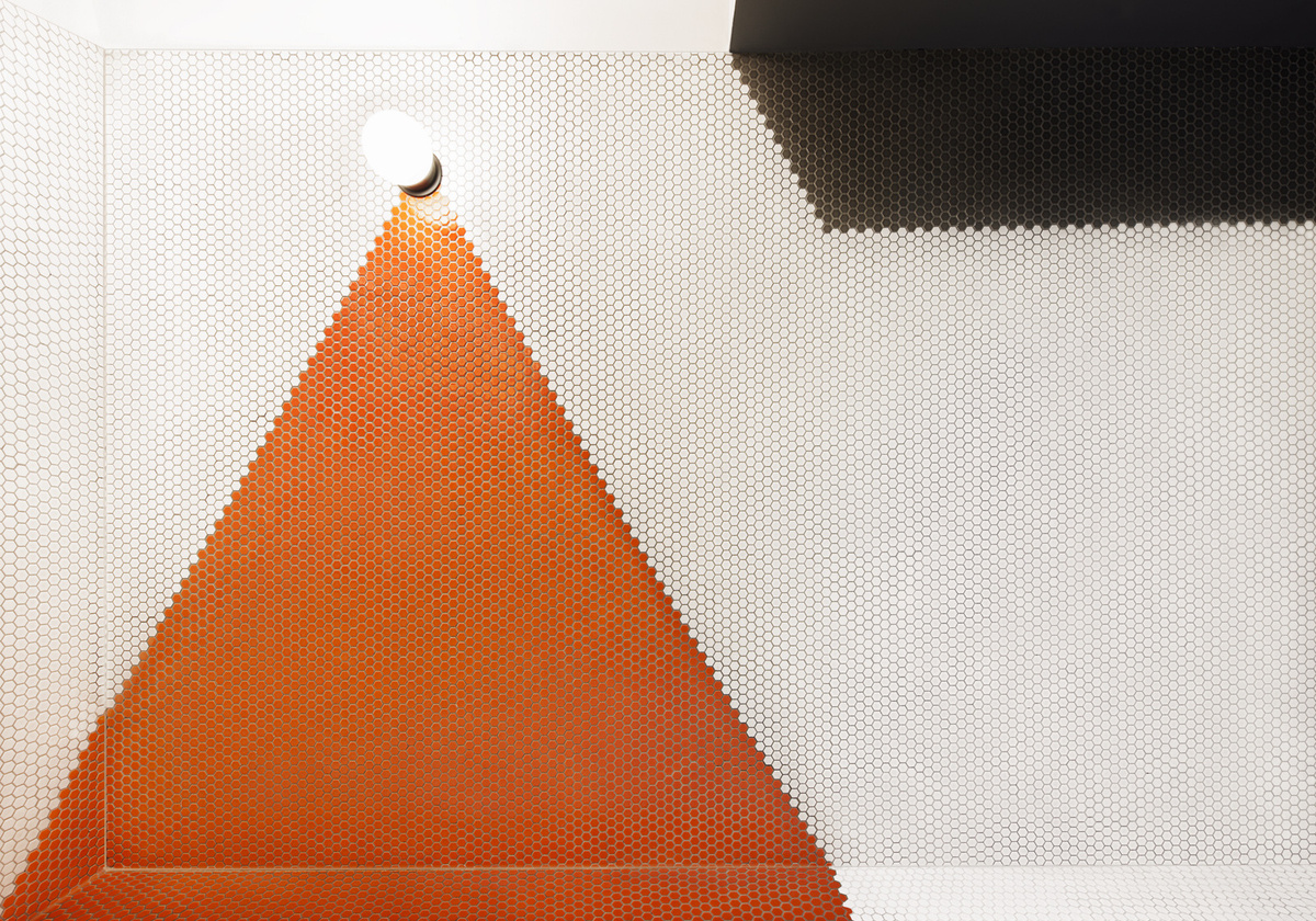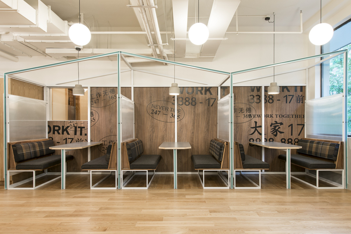 這種分段切割結(jié)構(gòu)的玩法繼續(xù)在儲(chǔ)藏室和座位角落的框架中發(fā)揮作用。材料分層,固定物暴露在外,從構(gòu)造上揭示了墻壁是如何組合在一起的。一個(gè)網(wǎng)格鋼筋結(jié)構(gòu)入儲(chǔ)藏室區(qū)域,體積的瞬間被切掉,讓客人占據(jù)空隙;精益和擱板被集成到框架中。橡木結(jié)構(gòu),內(nèi)襯背光聚碳酸酯,帶您前往會(huì)議室和電話亭。座位角落和電話亭嵌套在框架內(nèi),使用戶可以體驗(yàn)“墻”的兩側(cè)。浴室內(nèi)部鋪有馬賽克瓷磚;它們的顏色被放置在占據(jù)空間的物體的地板和墻壁上創(chuàng)造“陰影”。為所有壁紙和壁畫開發(fā)了自定義圖形。受上海白兔糖的啟發(fā),開發(fā)了兔子壁紙和藝術(shù)品的主題。會(huì)議室壁紙參考了巷道中常見的中國游戲;中國象棋和七巧板。在上海街頭經(jīng)??吹降膱D案印在整個(gè)公共座位區(qū),用中文和英文單詞播放,概括了WeWork的社區(qū)精神。
