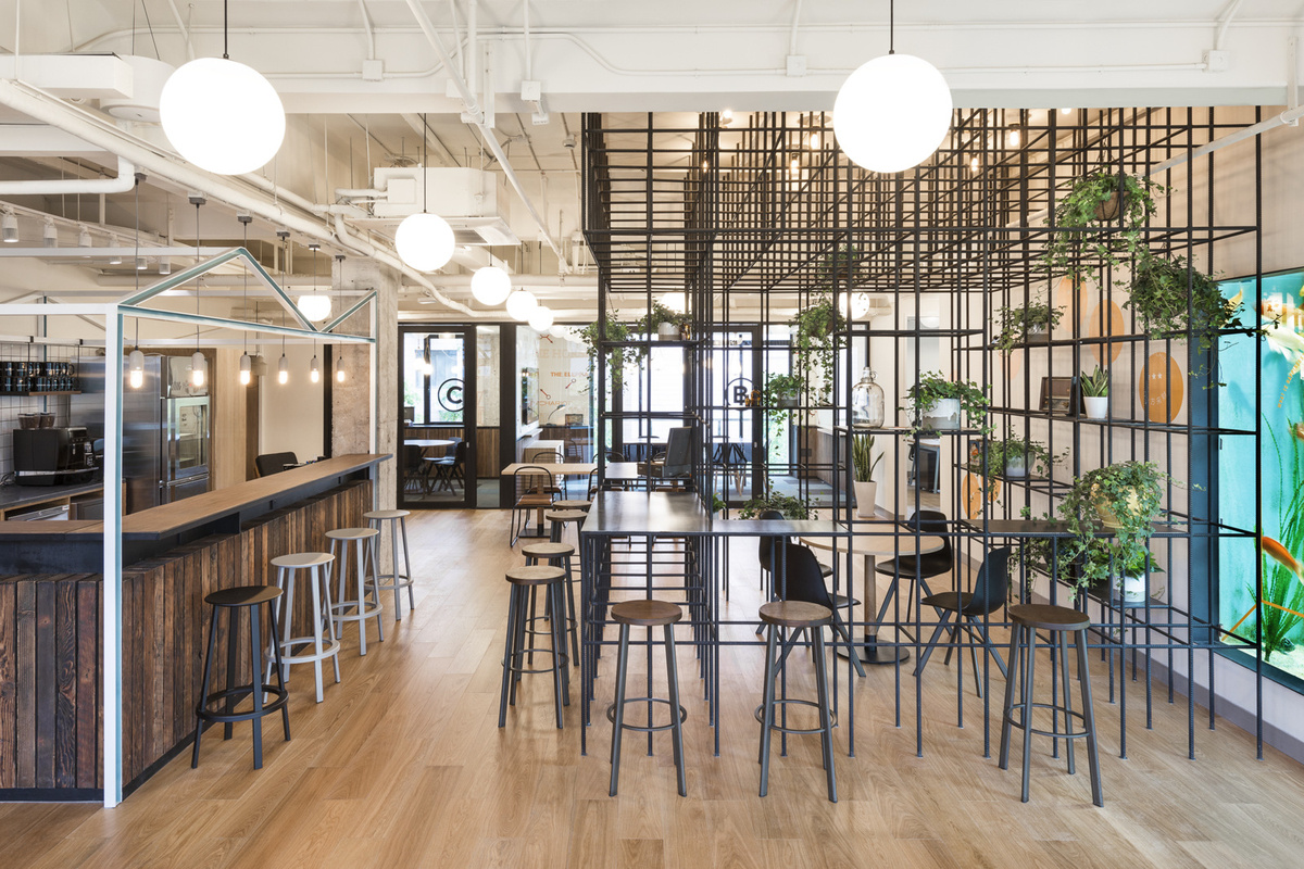 WeWork延平路位于上海市靜安區(qū)。該地區(qū)坐落在曾經(jīng)的英國定居點(diǎn),被龍?zhí)辽鐓^(qū)占據(jù)。這些房屋和巷道散布在整個(gè)地區(qū),許多現(xiàn)在作為他們前世的遺跡而存在。這些長塘是分段切割的,揭示了建筑物的結(jié)構(gòu)和內(nèi)部以及居民曾經(jīng)占用這些巷道房屋的方式。設(shè)計(jì)公司將此作為他們?yōu)閃eWork開發(fā)聯(lián)合辦公空間的概念方法。進(jìn)入后,一個(gè)房屋框架包圍了接待處,由白色金屬通道組成,通道內(nèi)部涂成藍(lán)藍(lán)色。聚碳酸酯分層在過濾照明的結(jié)構(gòu)上;在片刻之間,它被剝開,露出外面的結(jié)構(gòu)。前臺(tái)由回收的電視和收音機(jī)組成;在上海巷道中常見的物品。