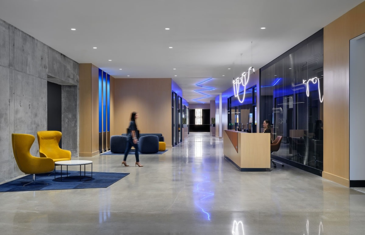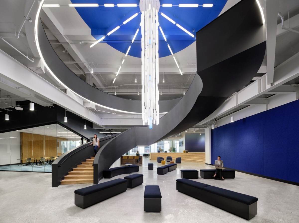 案例說明:為了應(yīng)對(duì)公司的發(fā)展,DMG與Luminaut合作創(chuàng)建了一個(gè)充滿活力的公司總部。他們的目標(biāo)是創(chuàng)造一個(gè)營造沉浸式環(huán)境的空間,激勵(lì)員工努力工作,同時(shí)擁抱充滿活力的工作與生活平衡。重新設(shè)計(jì)的工作空間跨越三個(gè)大樓層,面積超過10000平方米。
