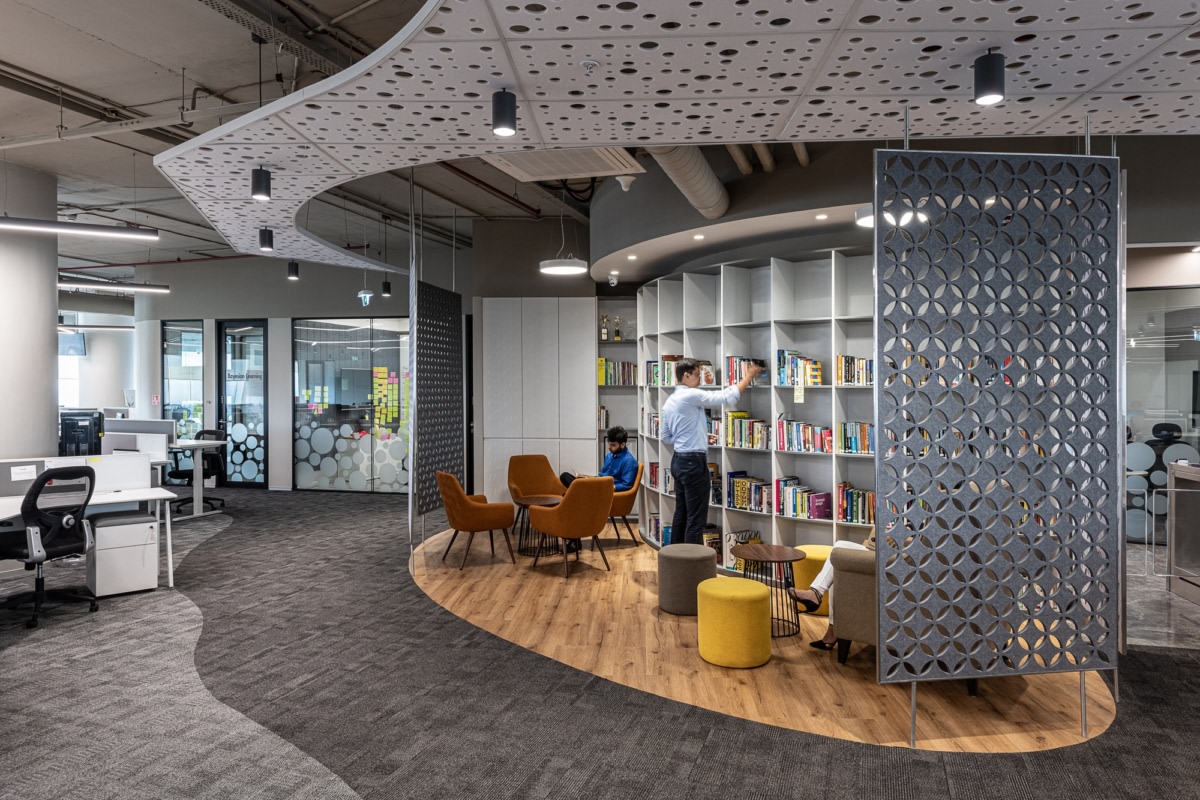 案例說(shuō)明:公司推動(dòng)討論的團(tuán)隊(duì)非常明確地表達(dá)了他們想要什么——以客戶為中心、學(xué)習(xí)和成長(zhǎng)、透明、挑戰(zhàn)極限和關(guān)注健康(自我和周圍環(huán)境)是構(gòu)成設(shè)計(jì)敘事基石的一些想法。這些都是為了提供一個(gè)活潑、年輕、充滿活力和智能的工作空間。公司工作文化非常注重協(xié)作。這方面已經(jīng)轉(zhuǎn)化為一系列分布在四個(gè)樓層的空間,以滿足不同優(yōu)勢(shì)和性質(zhì)的團(tuán)隊(duì)合作和互動(dòng)。
