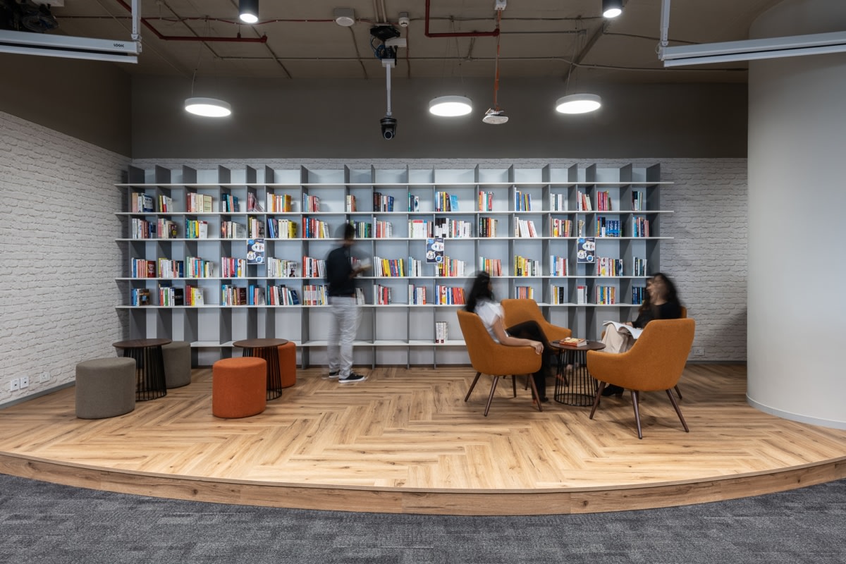 這些設(shè)施包括培訓(xùn)室、會(huì)議室、休息區(qū)、圖書館和咖啡點(diǎn),其中一些人可以使用基本的接待設(shè)施。在這些會(huì)眾區(qū)域內(nèi),這種性質(zhì)的工作空間所要求的技術(shù)優(yōu)勢(shì)體現(xiàn)在一系列促進(jìn)構(gòu)思和溝通的技術(shù)功能上。同樣,構(gòu)思工具、參考書和裝有TED式演講的平板電腦營(yíng)造了一個(gè)有利于知識(shí)更新和學(xué)習(xí)的環(huán)境。圖書館附近的活動(dòng)地板為公司的小型市政廳以及客戶與相關(guān)項(xiàng)目團(tuán)隊(duì)之間的討論提供了便利。這是一個(gè)沒(méi)有機(jī)艙的辦公室,因?yàn)楣颈荛_(kāi)了等級(jí)制度的典型表現(xiàn)形式。即使是高層管理人員也被安置在開(kāi)放式工作區(qū)。當(dāng)然,辦公桌功能會(huì)根據(jù)居住者的角色而變化。這種工作文化最有說(shuō)服力的例子是“奇點(diǎn)”的概念,其中最大會(huì)議室的桌子是無(wú)頭的——這意味著每個(gè)參與者在會(huì)眾中都享有平等的地位。