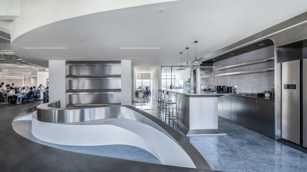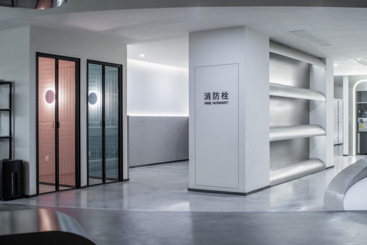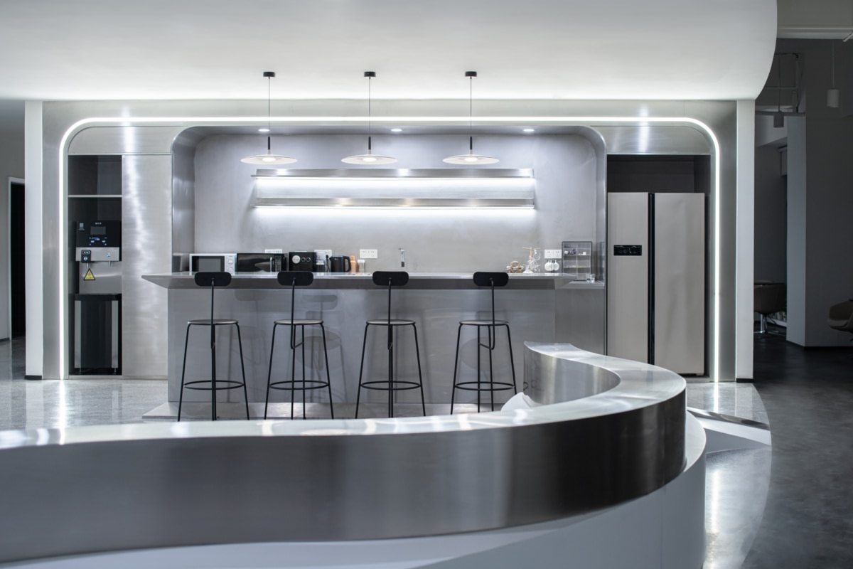 改造項(xiàng)目的目標(biāo)在創(chuàng)造輕盈和推斷未來之間暫停。波紋玻璃彎曲以形成一系列類似于級聯(lián)漣漪的曲面屏幕。通過半透明的玻璃屏幕,接待區(qū)全天體驗(yàn)到不斷變化的燈光效果,營造出一種恢復(fù)活力的感覺,這是美容行業(yè)不斷進(jìn)行的探索。不銹鋼包層休息區(qū)是交流的中心區(qū)域。理念碰撞、擴(kuò)散、沉淀,形成“智慧孤島”,為公司帶來新的活力。
