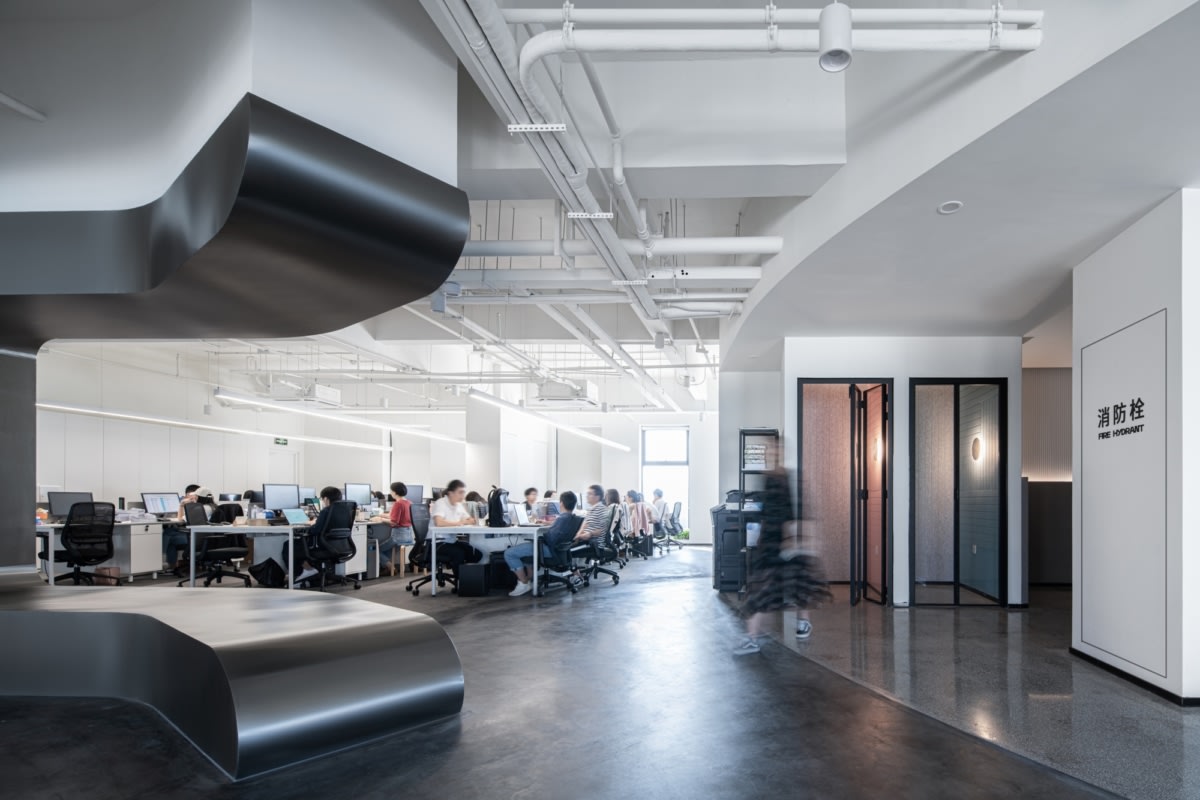引入“河流”作為流通的主要路徑,以及思想和創(chuàng)造力流動的載體。路徑的曲率引導(dǎo)新的空間秩序。它打破了僵化的結(jié)構(gòu)網(wǎng)格,在視覺上消除了柱子上重復(fù)的空間劃分。入口通向光線充足的接待空間,“河”上的旅程開始帶游客經(jīng)過會議室、大型休息室、開放式工作站和其他兩側(cè)的功能功能,標(biāo)志著在河岸上建立定居點(diǎn)。電話亭和工作角落等半私人空間被安排在“河流”動態(tài)流動的節(jié)點(diǎn)停頓處。在功能上,辦公室是一個自治的城市,配備了多樣化的生產(chǎn)和工作空間,以及健身房和室外屋頂花園。
