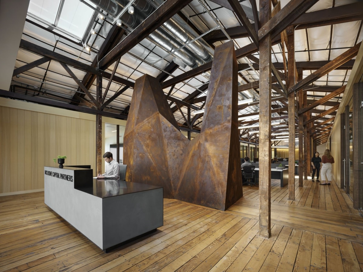 該辦公室項目客戶是一家專注于環(huán)境的投資公司,希望有一個反映其精神的辦公室。位于城市北端的一座歷史悠久的倉庫建筑中,干預(yù)很小,放大了歷史與新之間的對比。私人辦公室用落地玻璃門面和木質(zhì)細節(jié)環(huán)繞周邊,精心設(shè)計以表達空間的現(xiàn)有柱子。利用這些現(xiàn)有的樹狀結(jié)構(gòu)和散落在中央空間的天窗,該設(shè)計創(chuàng)造了一個開放的辦公區(qū)域,感覺就像森林中的空地。當您進入時,主要焦點是一個刻面風(fēng)化鋼雕塑,讓人聯(lián)想到分裂的紅木。這座雕塑一直延伸到天窗,既為開放式辦公室提供了隱私,又是空間的統(tǒng)一元素。該設(shè)計通過根據(jù)需要盡可能少地添加到空間中來慶??臻g的歷史。盡可能少地接觸現(xiàn)有的結(jié)構(gòu)和飾面。沒有使用地毯,只有區(qū)域地毯。墻壁不延伸到天花板/屋頂,而是有自己的自支撐外殼。從美學(xué)上講,設(shè)計的目標是贊美歷史,而不是模仿。因此,現(xiàn)有的粗糙木材與高度定制的新表面和結(jié)構(gòu)之間有明確的界限。
