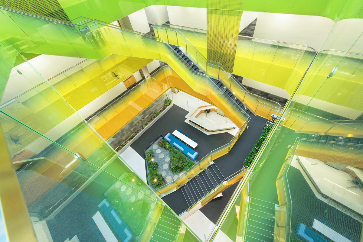 這種“聯(lián)系”的主要表現(xiàn)體現(xiàn)在光線充足的中央中庭中,該中庭鼓舞人心且大膽,在將建筑與中央樓梯連接起來的同時,給人一種多樣性的感覺。從赭石到綠色,最后是藍色的地板顏色漸變的靈感來自蘇州著名的園林,那里有肥沃的泥土、郁郁蔥蔥的樹冠和晴朗的天空。