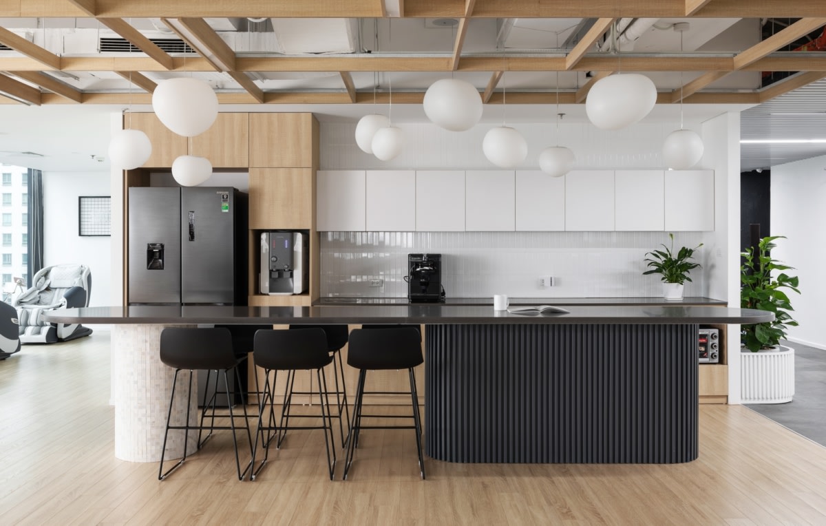 設(shè)計(jì)的該辦公室,以培養(yǎng)商業(yè)價(jià)值觀,保持領(lǐng)導(dǎo)者和文化的精神。進(jìn)入入口后,一個(gè)氛圍舒緩的接待休息室取代了傳統(tǒng)的接待區(qū),為客人和員工提供了非凡的體驗(yàn),并營造出一種放松和熱情的感覺。自助餐廳區(qū)設(shè)有大量落地窗,日光充足,可欣賞河內(nèi)喧囂的廣闊景色。為了最大限度地利用座位區(qū),設(shè)計(jì)了一張實(shí)木柜臺(tái)高度的酒吧桌,與小型可移動(dòng)餐桌一起環(huán)繞著空間。定制吧臺(tái)懸掛著云朵形吊燈,營造出優(yōu)雅而實(shí)用的焦點(diǎn),為下班后的聚會(huì)、會(huì)議和公司活動(dòng)提供咖啡和食物。