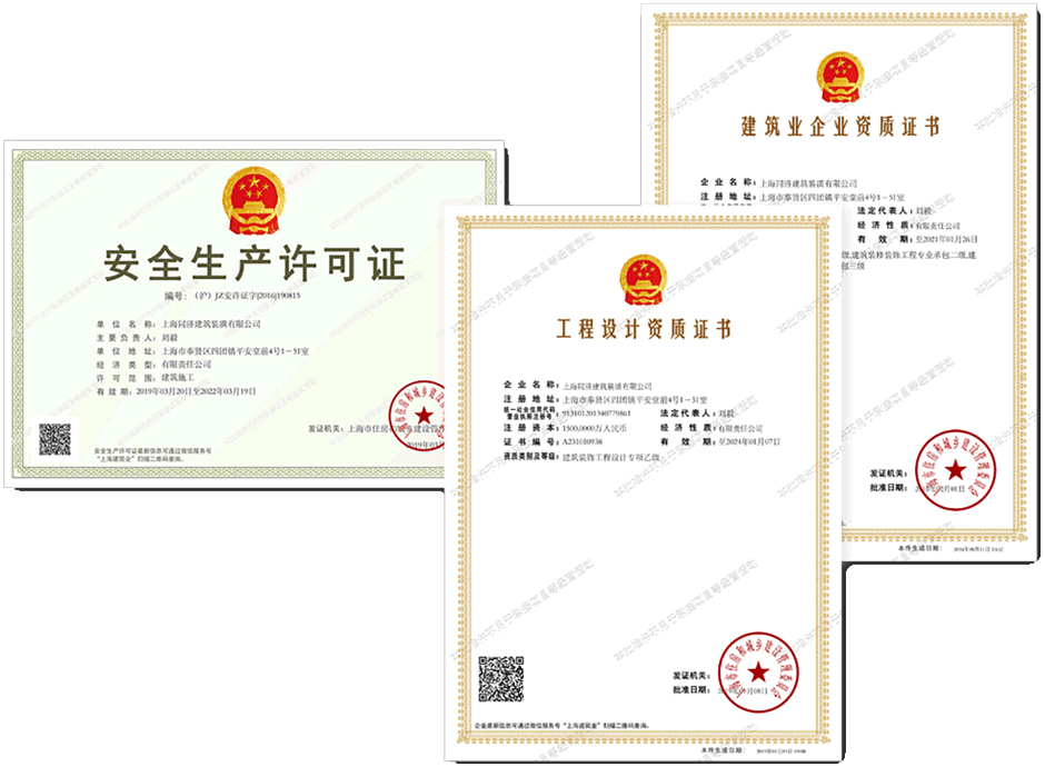 同濟目前已擁有國家建筑裝飾工程設(shè)計專項乙級、建筑裝修裝飾工程專業(yè)承包二級等資質(zhì)及相關(guān)的機電設(shè)備安裝、建筑幕墻、建筑智能化工程等配套施工資質(zhì),并通過了ISO9001/9002版質(zhì)量認證